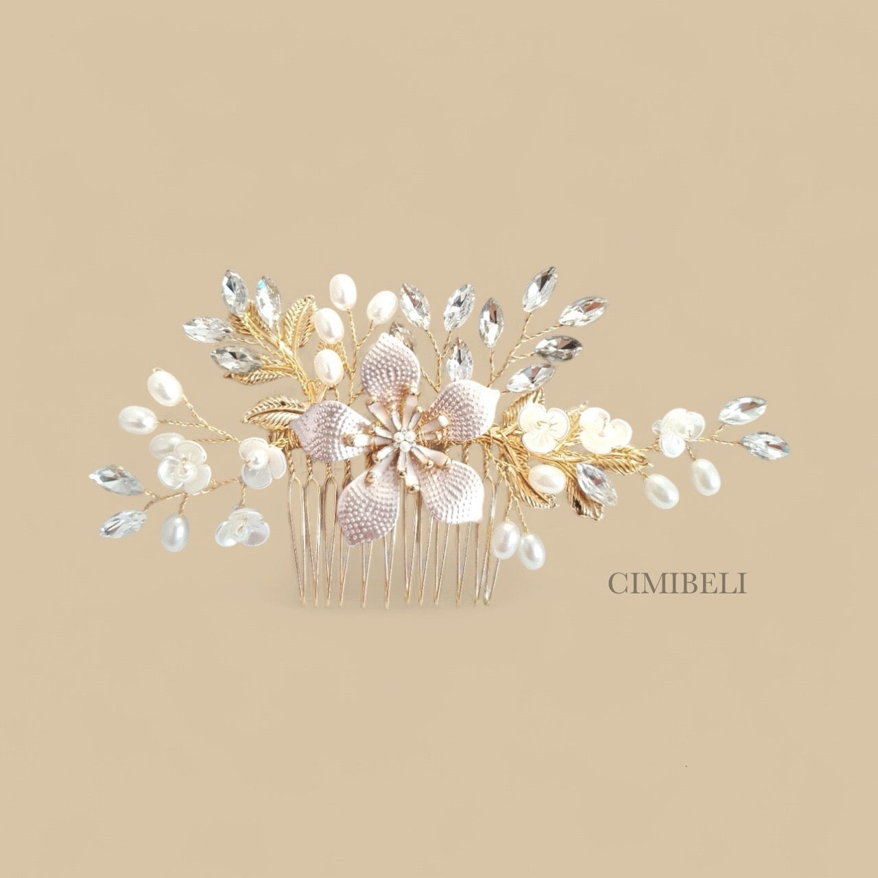 Peigne à cheveux mariée fleur or rose 'Allamanda'