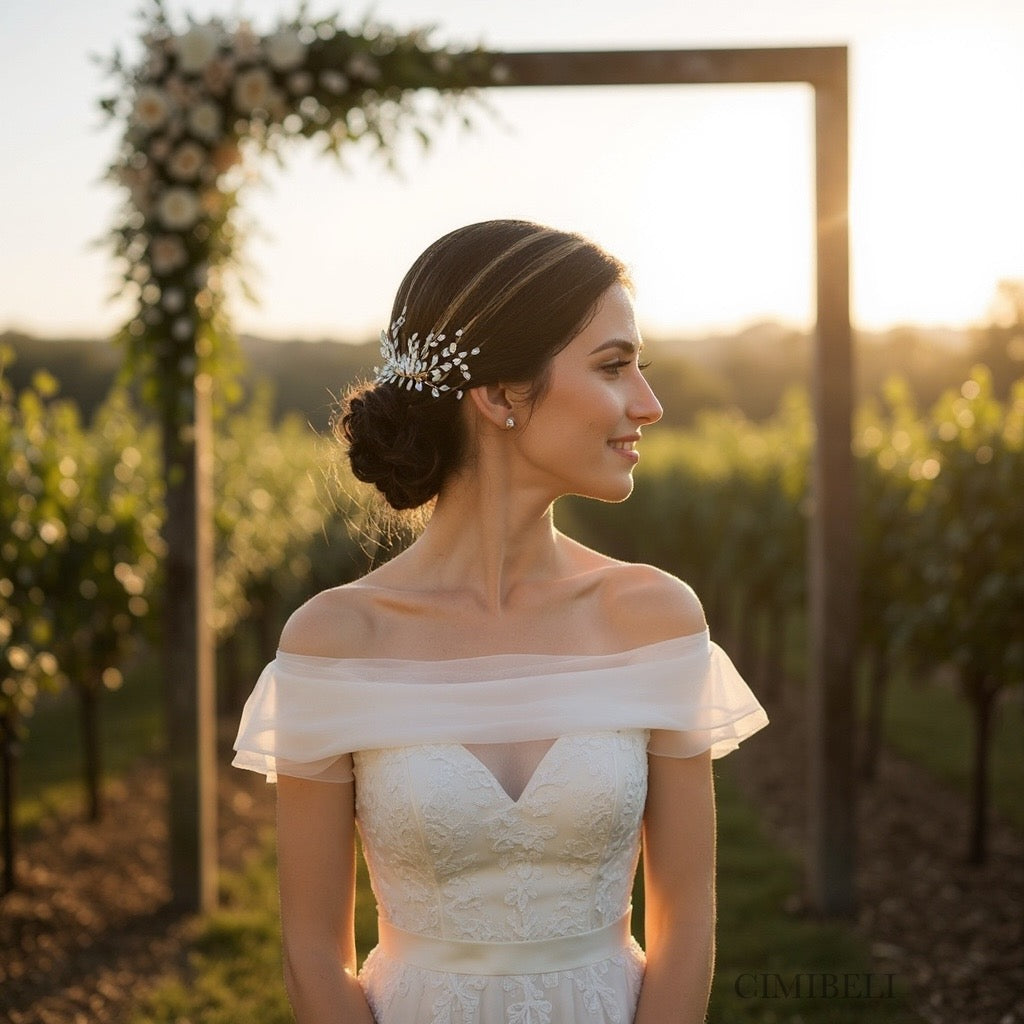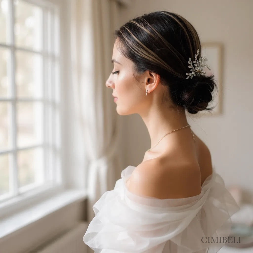 •Qu'il soit rentré dans un chignon, associé à un voile ou en tenant une partie de vos cheveux.