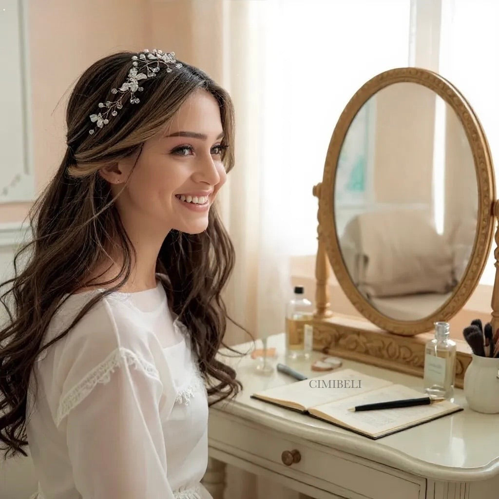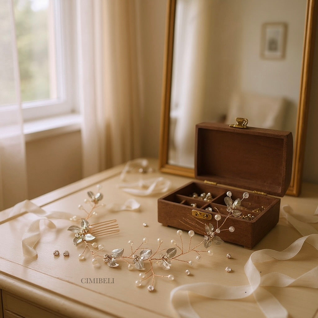 Les zirconiums, soigneusement intégrés dans le design, créent un éclat subtil et une lueur raffinée qui complète parfaitement toutes les coiffures de mariée, des chignons classiques aux coiffures plus modernes. Le côté métal assure une fixation sûre et confortable, tandis que les zircons ajoutent une dimension lumineuse et luxueuse à votre look.