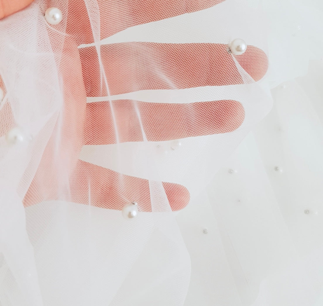 Notre voile de mariée en tulle français, délicatement orné de perles scintillantes, incarne l'élégance et le raffinement.