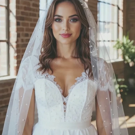 Chaque perle, finement dispersée, crée un effet lumineux qui capte les regards et apporte une touche de luxe unique. Conçu pour la mariée moderne en quête d'une silhouette sophistiquée, ce voile allie confort et beauté intemporelle. Un choix parfait pour un mariage inoubliable. Disponible dès aujourd'hui pour sublimer votre journée spéciale.